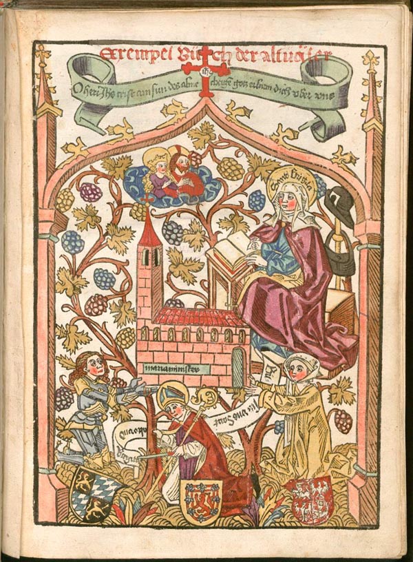 Gedenkblatt für den Übergang Altomünsters (Lkr. Dachau) an die Birgitten 1497. Der Holzschnitt zeigt die hl. Birgitta vor der stilisiert dargestellten Klosterkirche von Altomünster ("Mariaminister"). Unterhalb der Kirche kniet der hl. Alto (als Bischof), flankiert von Herzog Georg dem Reichen von Bayern-Landshut (reg. 1479-1503) und seiner Gemahlin Hedwig (1457-1502), welche die Kirche an Birgitta übergeben. 1599 wurde der Einblattdruck in eine Inkunabel eingeklebt und bei dieser Gelegenheit der Buchtitel in roter Tinte ("exempel Büch der altväter") nachgetragen. (Bayerische Staatsbibliothek, Rar. 330)