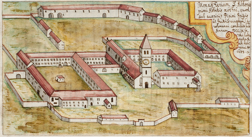 Älteste Ansicht des Klosters Altomünster (Lkr. Dachau) aus dem Jahr 1653 vom Weingartner Benediktiner Gabriel Bucelin (1599-1681). (Württembergische Landesbibliothek, HB.V.15)