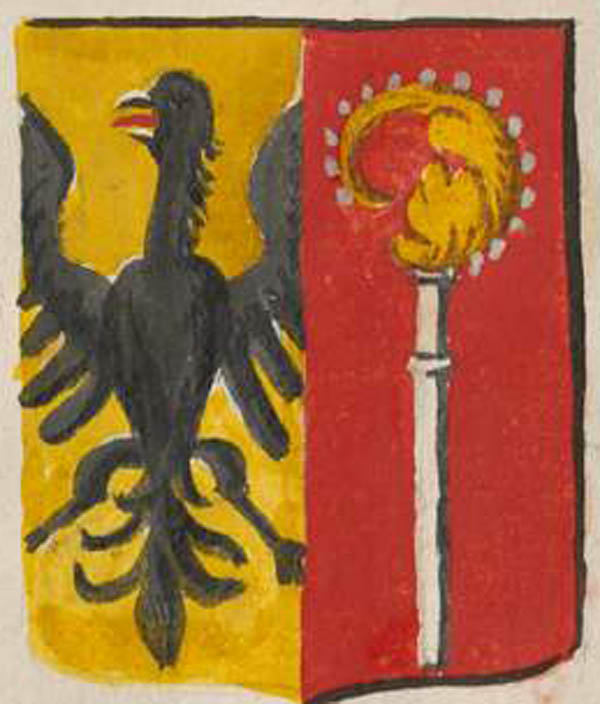 Das Wappen des Bistum Chiemsee. Abb. aus: Großes Wappenbuch, enthaltend die Wappen der deutschen Kaiser, der europäischen Königs- und Fürstenhäuser, der Päpste und Kardinäle, Bischöfe und Äbte bis zu den lebenden Repräsentanten zur Zeit der Regentschaft Kaiser Rudolfs II. und Papst Gregors XIII., Süddeutschland 1583, fol. 51v. (Bayerische Staatsbibliothek, Cod.Icon. 333 fol.51v)