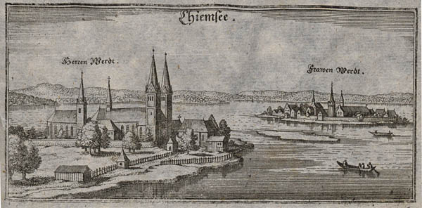 Die Chiemseeklöster. Im Vordergrund Herrenchiemsee, dessen Stiftskirche auch die Domkirche des Bistums war. Abb. aus: Matthäus Merian, Topographie Bavariae, Frankfurt am Main 1644, n. 114. (Bayerische Staatsbibliothek, Res/2 Bavar.601-1)