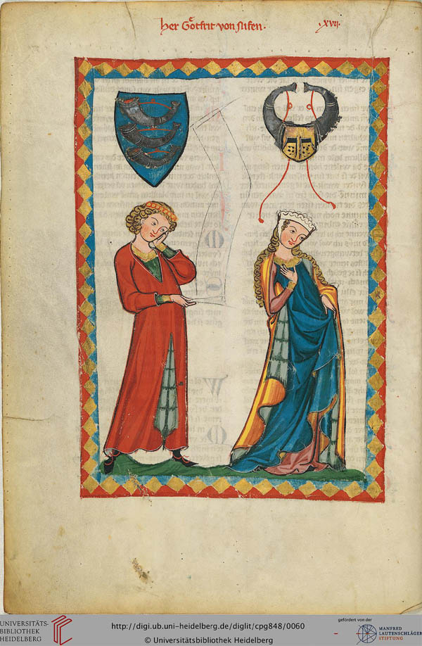 Der Minnesänger Gottfried von Neifen (erw. 1234-1255) im Codex Manesse. (UB Heidelberg, Cod. Pal. germ. 848, fol. 32v)
