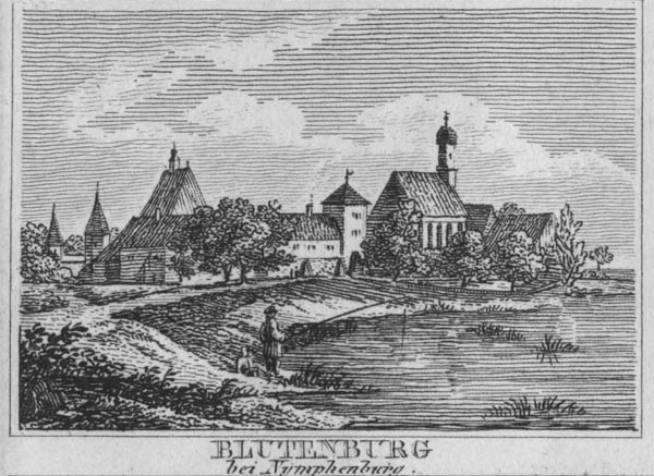 "Blutenburg bei Nymphenburg". Aus: Adolph von Schaden, Neueste Beschreibung der Haupt- und Residenzstadt München und deren Umgegend, 1838. (Bayerische Staatsbibliothek, Portrait- und Ansichtensammlung)