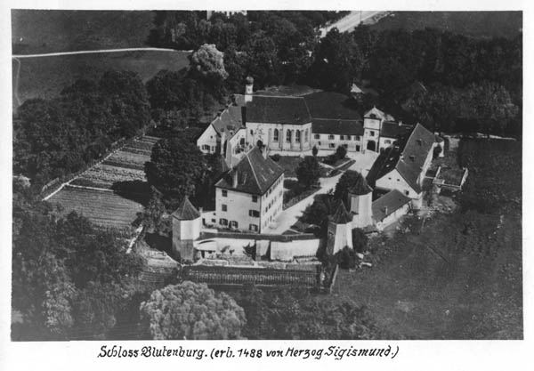 Luftaufnahme der Blutenburg, Postkarte um 1930. (Bayerische Staatsbibliothek, Portrait- und Ansichtensammlung)