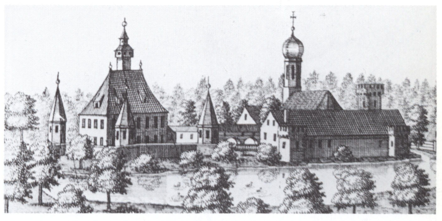 Ausschnitt. "Daß Schloß Plutenburg, sambt der Hoff-March Ober Mennczing", Stich von Michael Wening, Historico-Topographica Descriptio, Bd. 1: Das Renntambt München, München 1701, M 83. (Bayerische Staatsbibliothek)