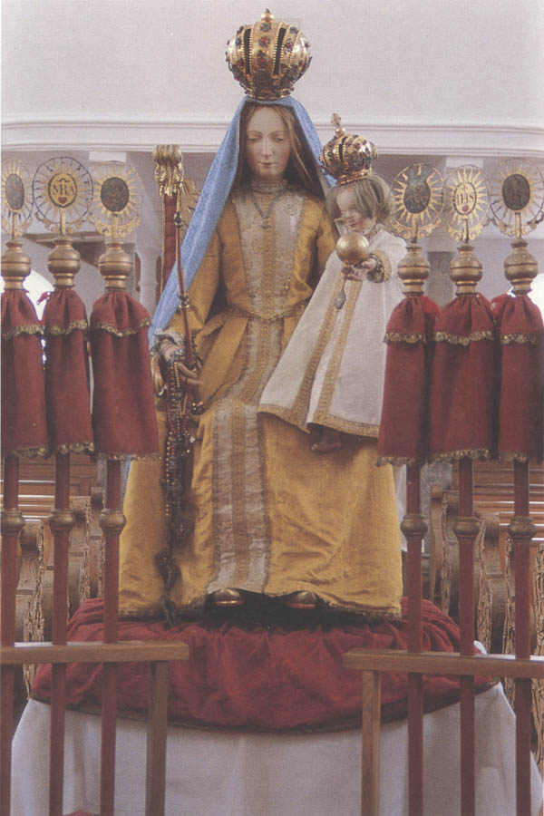 Bruderschaftsmadonna von Ried (Markt Dinkelscherben, Lkr. Augsburg) und Bruderschaftsstäbe mit Mäntelchen. (Foto: Walter Pötzl)