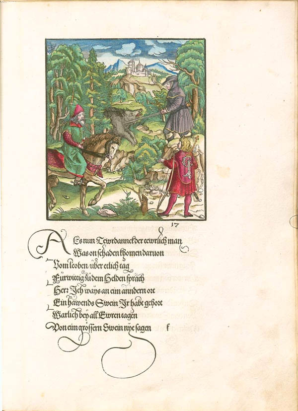 Illustrierte Seite aus dem bei Johann Schönsperger d. Ä. (um 1455-1521) gedruckten Heldenepos "Theuerdanck". (Bayerische Staatsbibliothek, Rar. 325a)