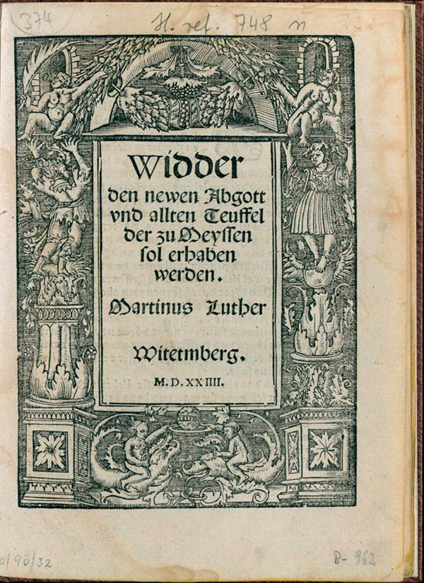 Titelblatt einer Luther-Flugschrift: Widder den newen Abgott und allten Teuffel, der zu Meyssen sol erhaben werden, Wittenberg 1524. Luther wendet sich gegen die Verehrung des 1523 heilig gesprochenen Benno von Meißen (gest. 1106), des heutigen Stadtpatrons von München. (Bayerische Staatsbibliothek)