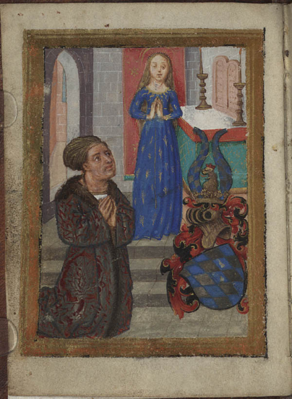 Erbauungs-Büchlein für Herzog Sigismund von Bayern-München (reg. 1460-1467). Der Herzog vor Maria im Ährenkleid. Nürnberg 1494. (Bayerische Staatsbibliothek, Cgm 134, f. 1v)