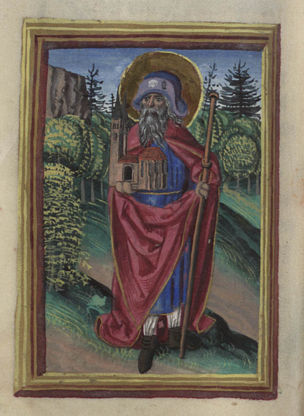 Gebetbuch: Heiliger Sebald mit der Nürnberger Sebalduskirche. Nürnberg, 1476. (Bayerische Staatsbibliothek, Cgm 127, f. 325v)