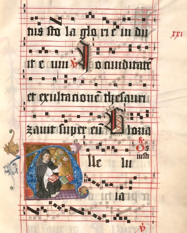 Graduale des Klosters Altenhohenau. Miniatur mit Darstellung des hl. Dominikus. Altenhohenau/Nürnberg, 1480/81. (Bibliothek des Metropolitankapitels München, Chorbuch Altenhohenau Nr. 3, f. 27r)