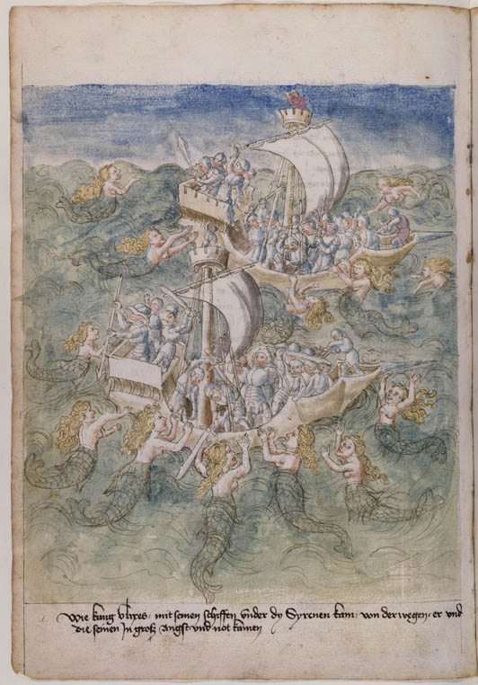 Guido de Columnis, Geschichte der Zerstörung Trojas: Ulysses bei den Sirenen. (Bayerische Staatsbibliothek, Clm 61, f. 186v)
