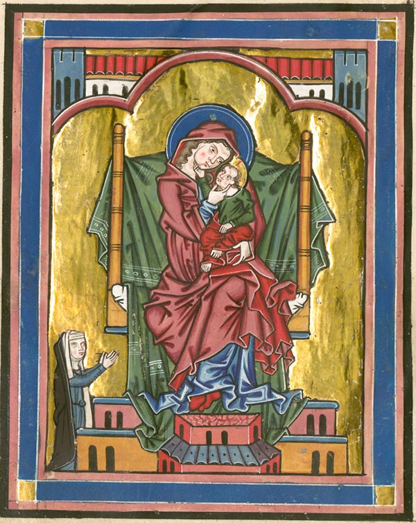 "Goldenes Buch von Hohenwart": Maria mit Kind, vor denen eine weibliche Stifterfigur kniet. Regensburg, bald nach 1250. (Bayerische Staatsbibliothek, Clm 7384, f. 3v)