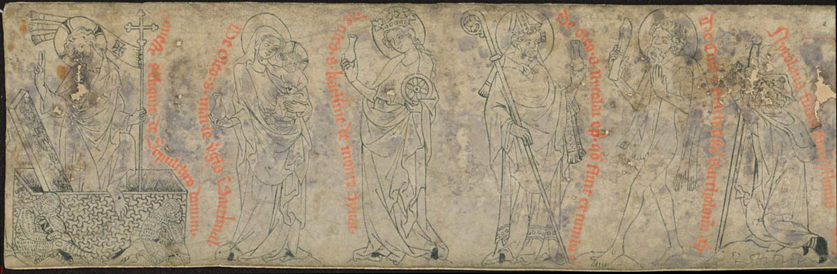 Reliquienverzeichnis: Auferstehung Christi und Maria mit Kind und Heiligen. Passau, zwischen 1333 und 1340. (Bayerische Staatsbibliothek, Clm 30035)