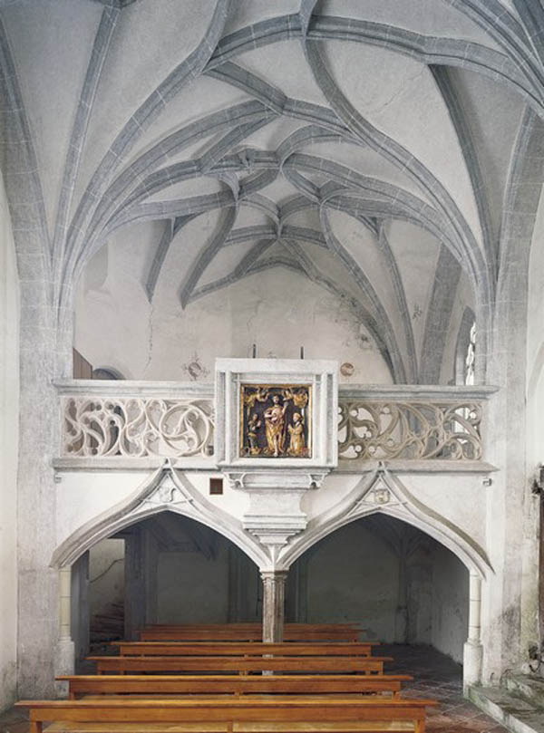 Westempore der Hedwigskapelle in der Burg Burghausen mit Stifterrelief Herzog Georgs des Reichen und der Herzogin Hedwig. (Foto: Bayerische Verwaltung der staatlichen Schlösser, Gärten und Seen)