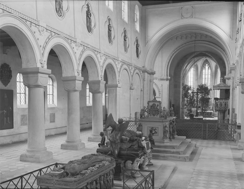 Die Hohenzollern-Grablege im Kloster Heilsbronn. Das Foto aus der Zeit um 1900 zeigt die historisierende Innenausstattung von Friedrich von Gärtner (1791-1847), die 1946-1955 entfernt wurde. (Bayerisches Landesamt für Denkmalpflege)