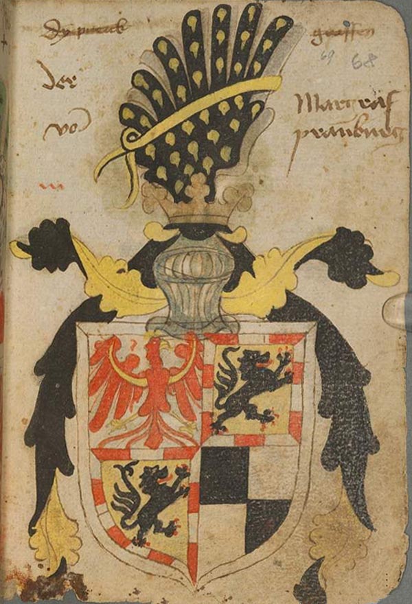 Wappen der Markgrafen von Brandenburg. Darstellung von 1466 im Ortenburger Wappenbuch. Das Wappen zeigt den roten Brandenburger Adler, das Löwenwappen des Burggraftums und das Stammwappen der Zollern. (Bayerische Staatsbibliothek, Cod.Icon 308 u, fol. 68r)