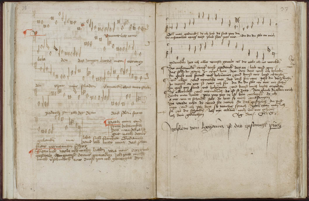 Doppelseite 36/37 aus dem Lochamer Liederbuch. Links das Liebeslied "All mein gedencken dy ich hab" , rechts Tenorlied "Unmut hat mir beladen", darunter der Besitzvermerk des Wolflein von Lochamer. (Staatsbibliothek Berlin, Preußischer Kulturbesitz, Ms. Mus. 40.613)