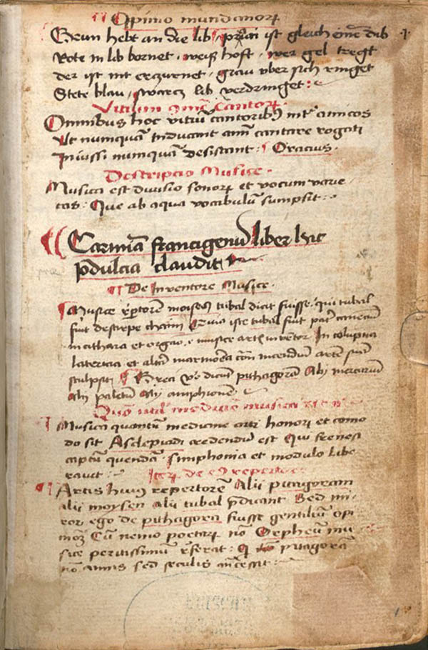Titel oder Motto des Liederbuchs des Hartmann Schedel (1440-1514): "Carmina francigenum liber hic predulcia claudit". (Bayerische Staatsbibliothek, Cgm 810, fol. 1r)