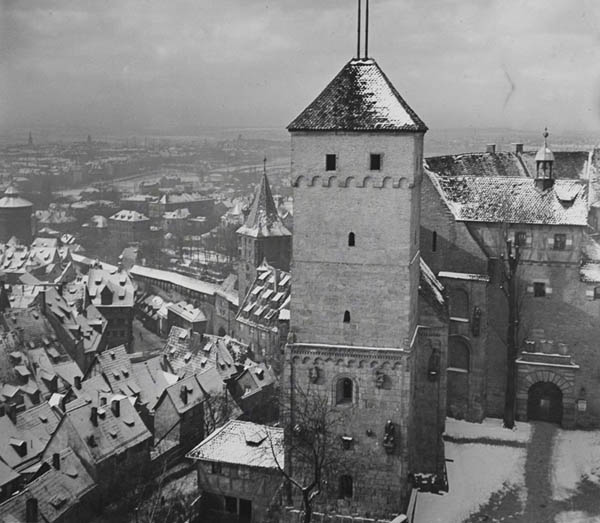 Heidenturm und Doppelkapelle der Nürnberger Burg nach der Renovierung durch Rudolf Esterer. Der Putz der meisten Gebäude wurde entfernt, da das Mittelalterbild des Dritten Reiches steinsichtige und unverputzte Mauern erforderte. (Bayerisches Landesamt für Denkmalpflege)