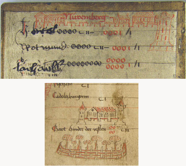 Früheste Darstellung der Nürnberger Burg im Wachstafelzinsbuch von ca. 1425. (Staatsarchiv Nürnberg, Nbg_Salbuecher_15c_fol 1b und 2b)