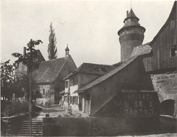 Die Walpurgis-Kapelle auf der Nürnberger Burg. Fotografie von Ferdinand Schmidt (1840-1909) Ende des 19. Jahrhunderts. Im Hintergrund der Sinnwellturm, das Gebäude im Vordergrund wurde 1540 errichtet und nach 1897 abgerissen. (aus: Julius Bier, Das Alte Nürnberg in Anlage und Bau, Nürnberg 1926, Tafel 6)