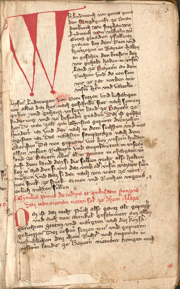 Initiale zum Oberbayerischen Landrecht, 3. Viertel 14. Jahrhundert, Raum München. (Bayerische Staatsbibliothek, Cgm 2150)