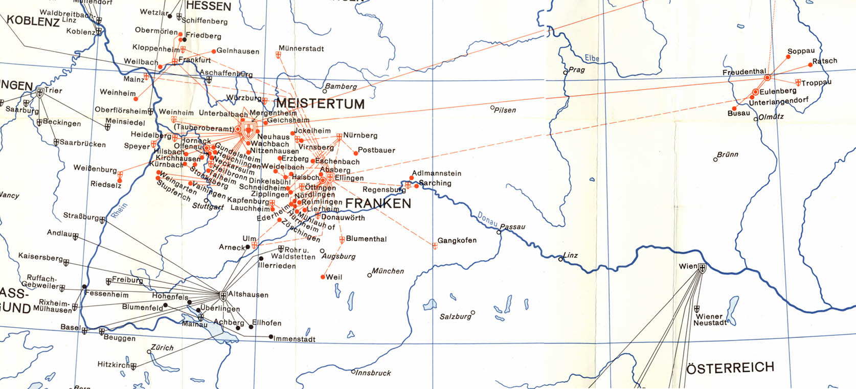 Die Kommenden und Ämter des Deutschen Ordens 1788 Rot dargestellt sind die Ballei Franken mit Sitz in Ellingen und die Balleien des Meistertums [aus: Hofmann, Der Staat des Deutschmeisters, Karte2]