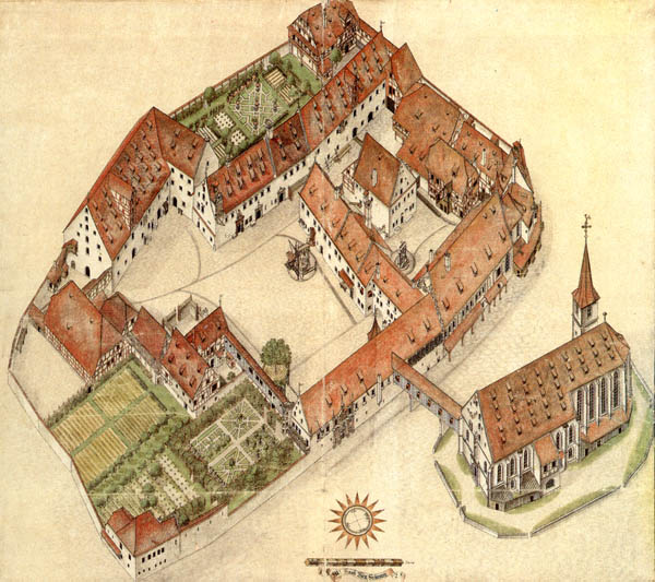Die Deutschordens-Niederlassung in Nürnberg 1624 Ansicht von Hans Bien [gest 1632] von 1624 Die Deutschordensniederlassung in Nürnberg bildete eine katholische Enklave in der evangelischen Reichsstadt Nicht zuletzt deshalb verband ein 1632 abgerissener Gang das Konventsgebäude mit der ehemaligen Ordenskirche St Jakob auf der anderen Straßenseite, deren Nutzung aber dem Orden seit 1532 verwehrt war [Germanisches Nationalmuseum HB3097]