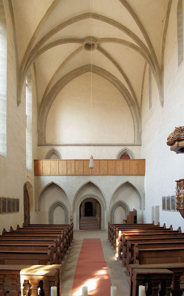 Mariaburghausen (Stadt Haßfurt, Lkr. Haßberge), ehemalige Klosterkirche. Blick in Richtung Westen auf die Trennwand zwischen Laienkirche und Klausurbereich mit ehemaliger Nonnenempore und darunter liegendem, gewölbten Bereich. (Bayerisches Landesamt für Denkmalpflege)