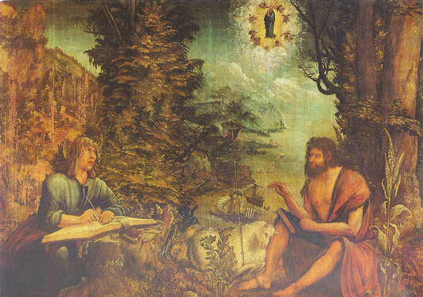 Albrecht Altdorfer: Johannes auf Patmos und Johannes der Täufer in stimmungsreicher Landschaft (wohl 1507). (Stadtmuseum Regensburg, Leihgabe des St. Katharinenspitals)