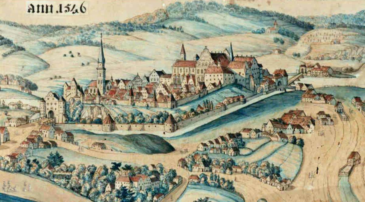 Die Stadt Neuburg von Süden. Nachzeichnung eines Ölbildes aus der Mitte des 16. Jahrhunderts, 1847. (Graphiksammlung des Historischen Vereins Neuburg a.d.Donau G 109)