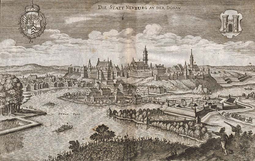 Die Stadt Neuburg von Norden gesehen. Stich von Matthäus Merian (1593-1650) in der Topographia Bavariae von 1644. (Bayerische Staatsbibliothek)