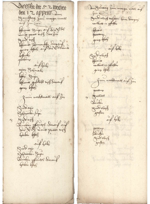 Speisenordnung für eine Woche am erzbischöflichen Hof in Salzburg aus der Regierungszeit des Herzogs Ernst von Bayern (reg. 1540-1554). (BayHStA Erzstift Salzburg, Lit. 170, fol. 1f.; Abdruck in Strauss, Speiseanordnung, 597f., hier: die Ordnung von Samstag und Sonntag)