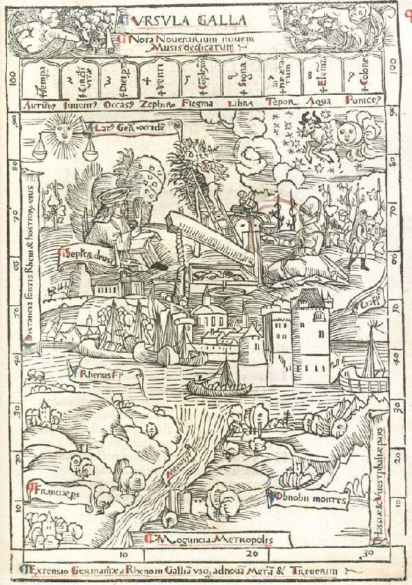 Ansicht der Stadt Mainz um 1500 [aus: Conradi Celtis Protvcii Primi Inter Germanos Imperatoriis Manibvs Poete Lavreati Qvatvor Libri …, Nürnberg1502]