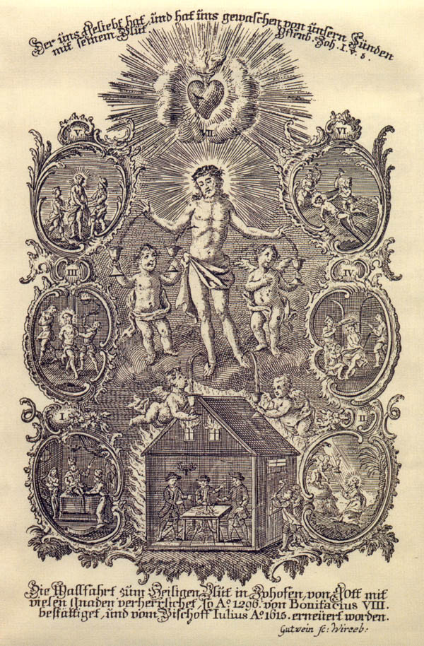 Andachtsbild des Würzburger Kupferstechers Johann Balthasar Gutwein (1702-1785) zur Hl. Blutwallfahrt in Iphofen mit Darstellung der Hostienfrevellegende. Die Wallfahrtskirche ist erstmals 1329 bezeugt. Die nicht verifizierbare Jahreszahl 1296 legt nahe, dass die Legende als Reflex auf den Rintfleisch-Pogrom entstand, der 1298 auch Iphofen betraf. (Katholisches PfarramtIphofen)