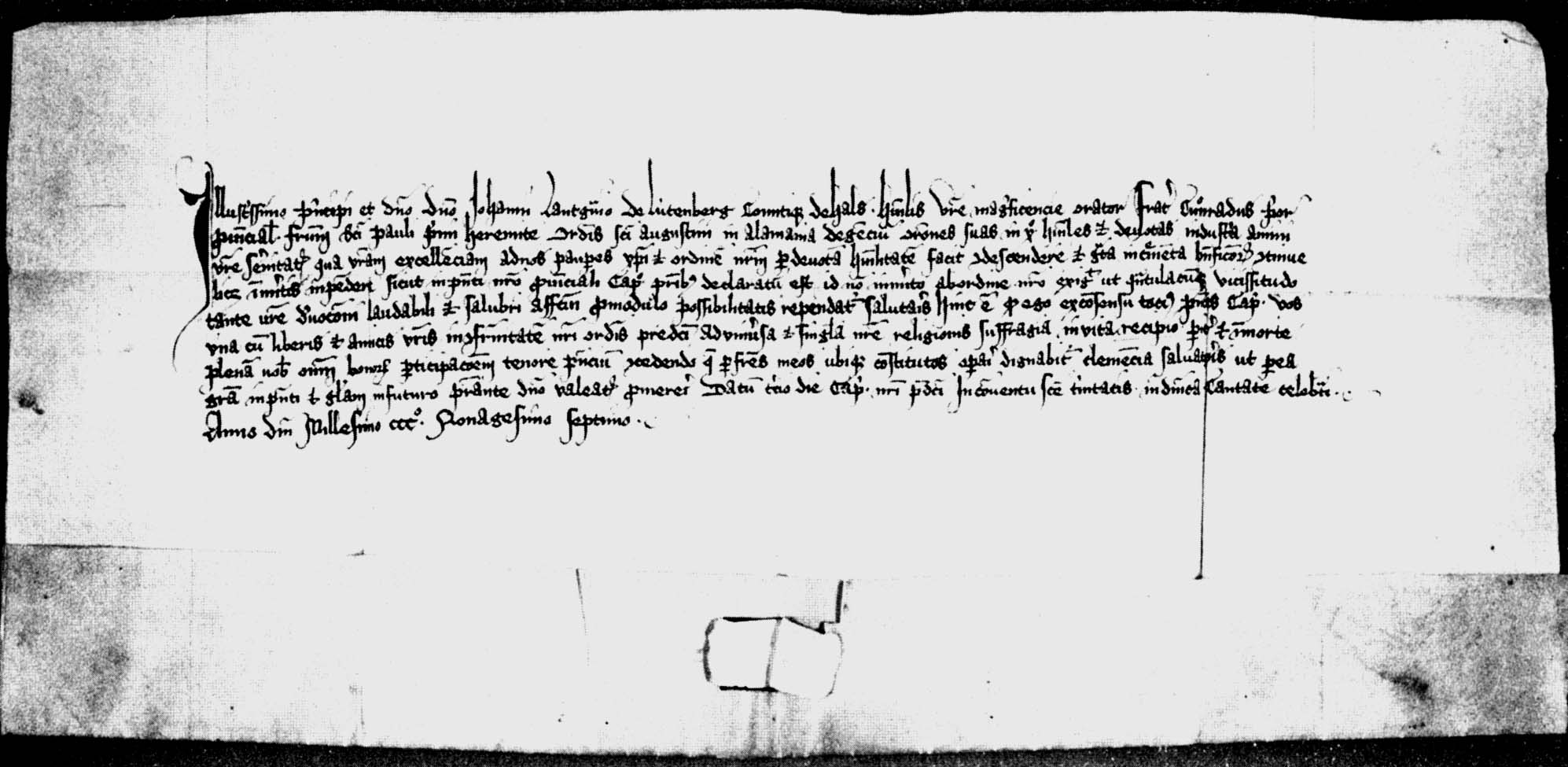 Dankesbrief [lateinisch] des Ordensprovinzials der Pauliner an Landgraf Johann I von Leuchtenberg vom 20 Mai 1397 [Bayerisches Hauptstaatsarchiv München, Landgrafschaft Leuchtenberg U227]
