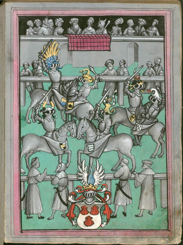 Tunierszene mit dem Eyb'schen Wappen aus dem Turnierbuch Ludwigs (VI.) von Eyb. (Bayerische Staatsbibliothek, Cgm 961)