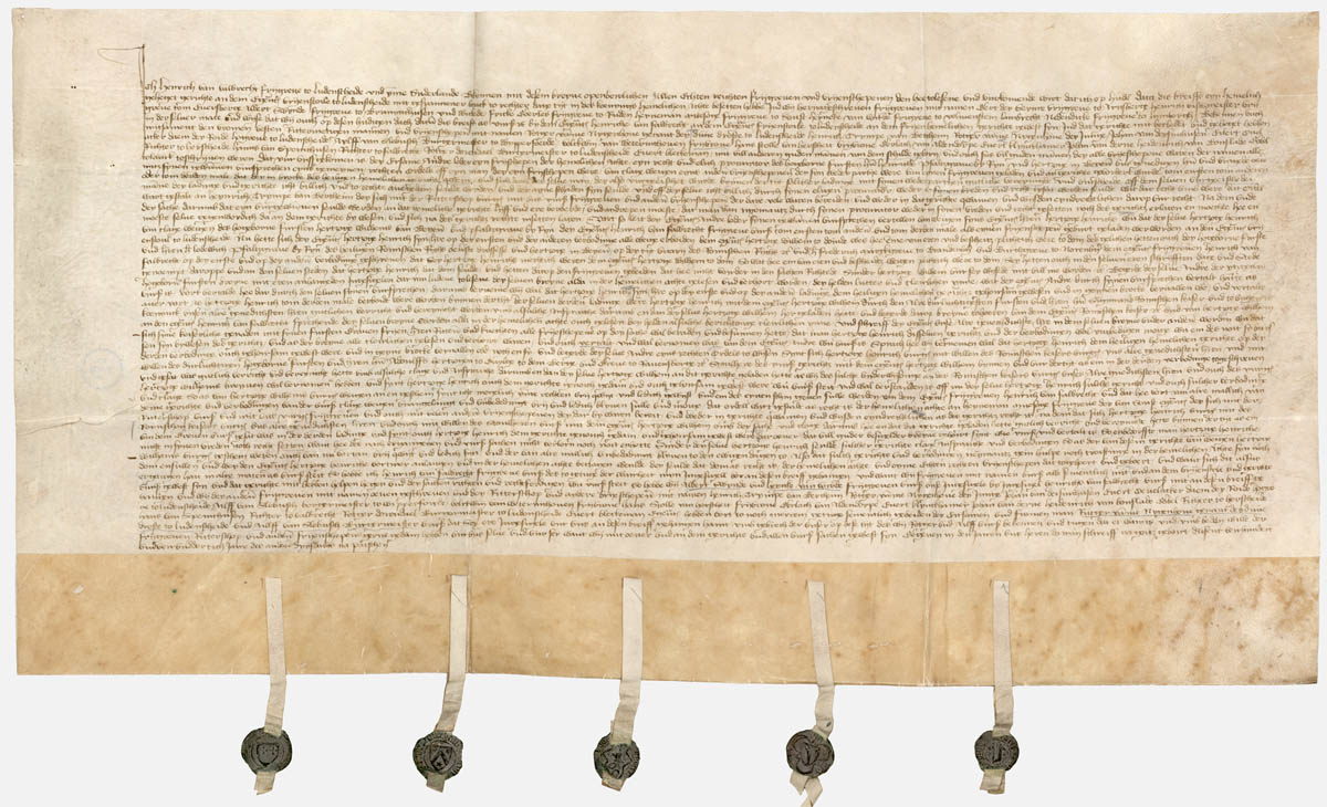 Gerichtsbrief des Freigrafen Heinrich von Valbrecht vom 30. März 1434 mit fünf anhängenden Siegeln (darunter drei von Freigrafen), entstanden im bayerischen Vetternkrieg. (Bayerisches Hauptstaatsarchiv, Pfalz-Neuburg, Reichssachen, U148)