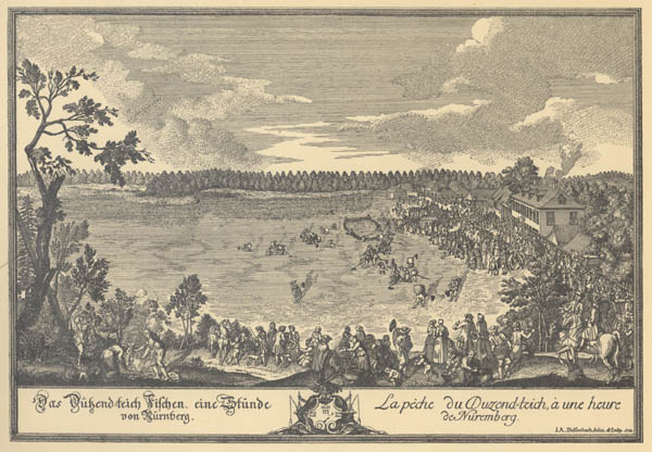 Das Abfischen des Nürnberger Dutzendteichs. Kupferstich von Johann Adam Delsenbach (1687-1765). (Bayerische Staatsbibliothek, Porträt- und Ansichtensammlung)