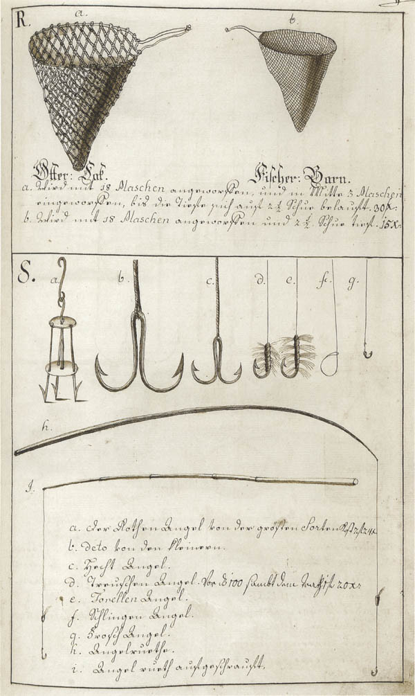 Fischernetze und Angelhaken im Kemptner Fischereibuch. (Staatsarchiv Augsburg, Fürststift Kempten Fischereiamt B 1, 362)