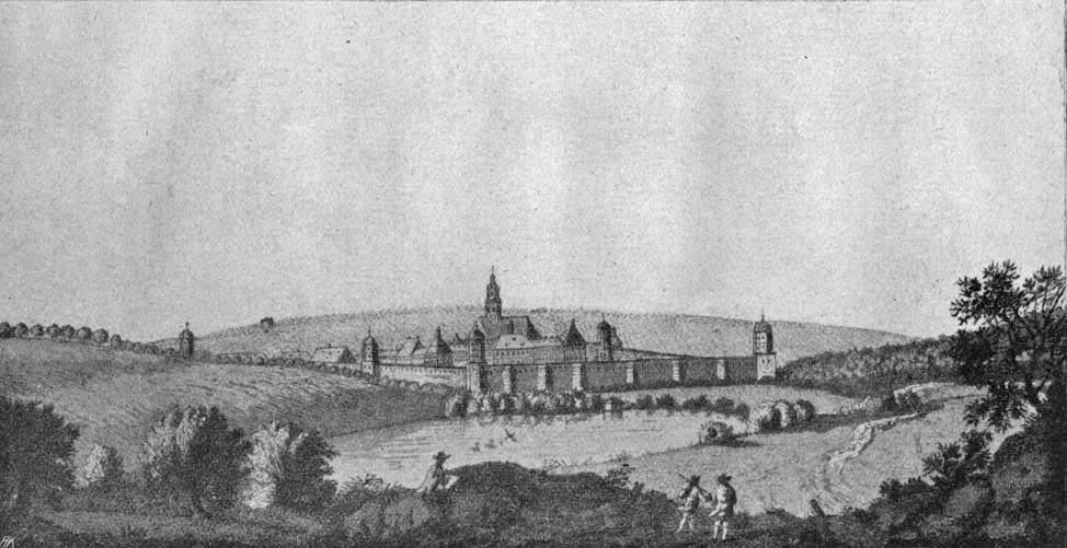Ansicht der Reichsabtei Kaisheim, nach einem Kupferstich des Joh. Müller von Nördlingen von 1790. (Abb. aus: P. Marian Gloning, Konrad Reuter. Abt von Kaisheim 1509-1590, in: Studien und Mitteilungen zur Geschichte des Benediktinerordens und seiner Zweige 33 [1912])