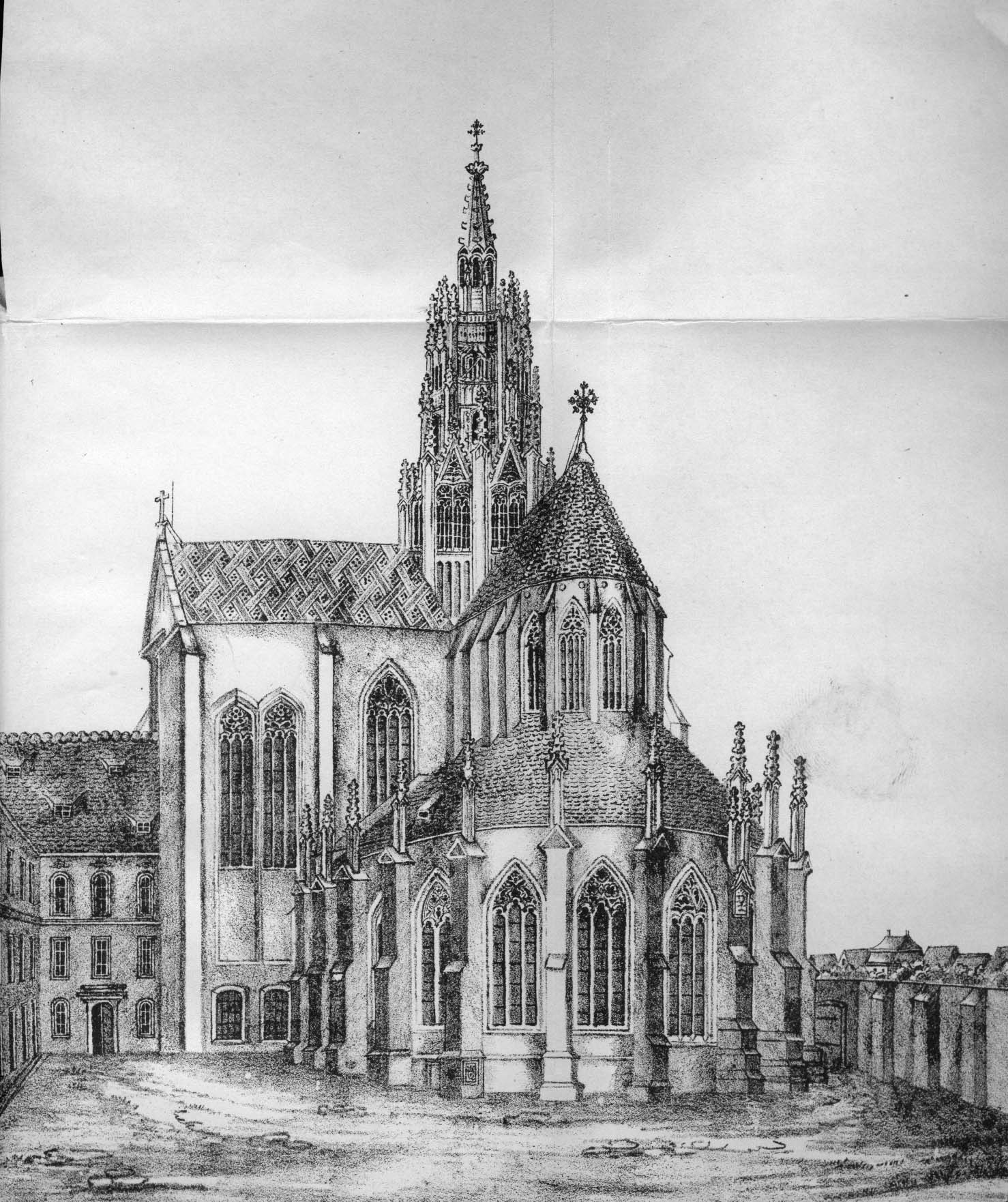 Ansicht der Kaisheimer Klosterkirche, ca. 1850. (Abb. aus: Martin Scheidler, Chronik des ehemaligen Reichsstiftes Kaisersheim nebst einer Beschreibung der Kirche, Nördlingen 1867, Tafel 6)