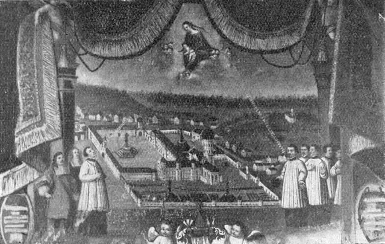 Ansicht des Reichsstifts Wettenhausen, um 1658. (Abb. aus: Franz Mayer, Geschichtsbilder vom ehemaligen Reichsgotteshaus Wettenhausen, Illertissen 1928, 78)