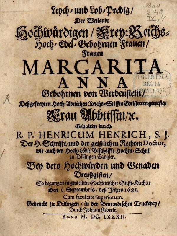 Titelblatt der Leichenpredigt des Kanzlers der Universität Dillingen, Heinrich Henrich (1614-1682), für Margarita Anna von Werdenstein (gest. 1681), Äbtissin des Reichsstifts Edelstetten (gedruckt in Dillingen 1682). (Bayerische Staatsbibliothek, 4 Bavar. 2140,IX,7)