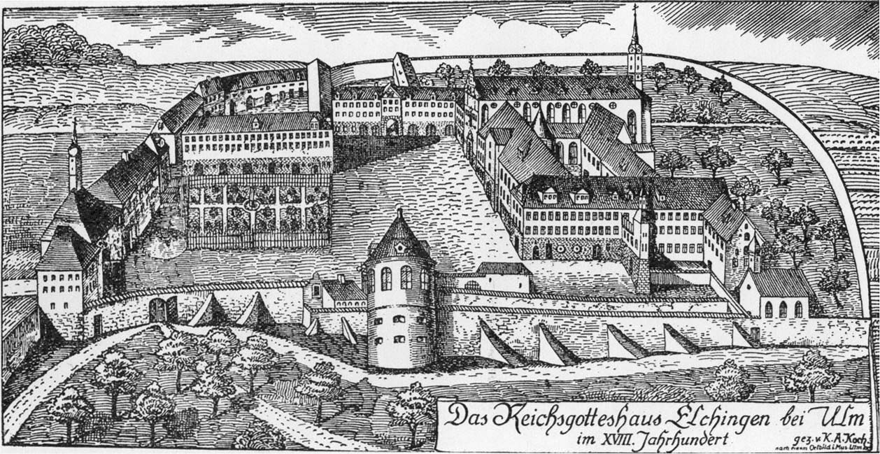 Ansicht der Reichsabtei Elchingen im 18. Jahrhundert. Zeichnung von K.A. Koch (1869-1945) nach einem Gemälde im Ulmer Museum. (Abb. aus: Franz Josef Hagel, Kloster Elchingen, Augsburg 1928, Bild 1)
