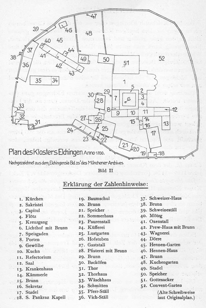 Plan der Reichsabtei Elchingen, Zustand um 1700, nachgezeichnet im frühen 20. Jahrhundert. (Abb. aus: Franz Josef Hagel, Kloster Elchingen, Augsburg 1928, Bild 2)