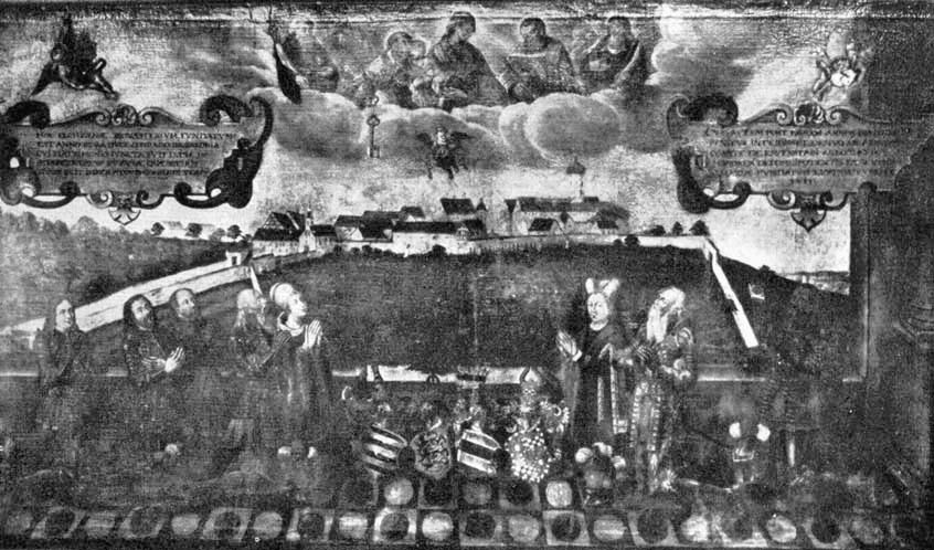 Ansicht der Reichsabtei Elchingen mit Stifterfamilie. Gemälde von 1685. (Abb. aus: Franz Josef Hagel, Kloster Elchingen, Augsburg 1928, Tafel 1)