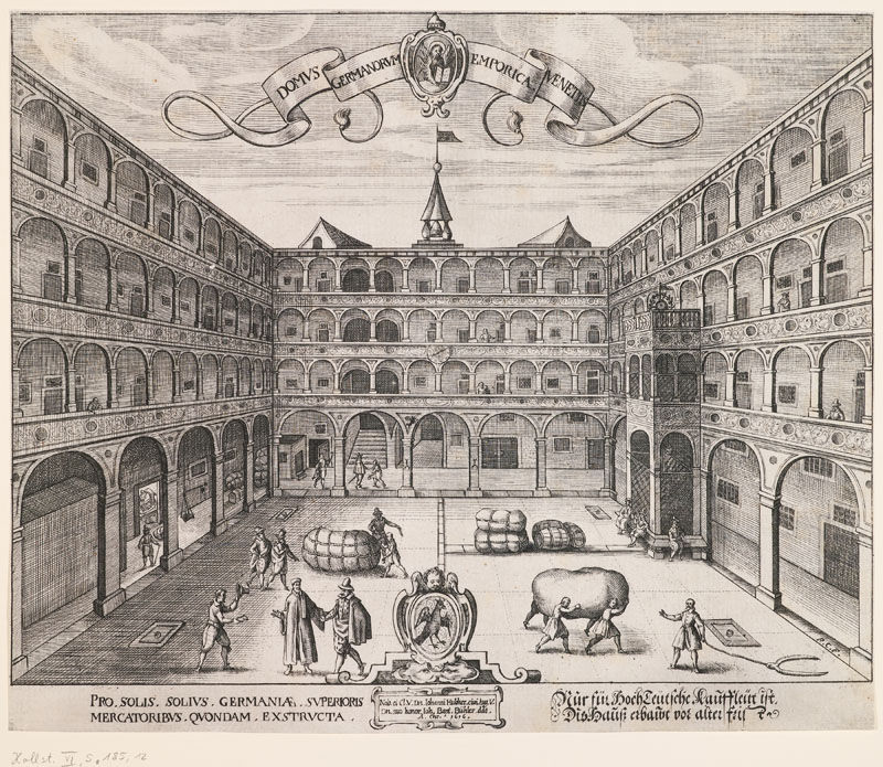 Innenhof der deutschen Handelsniederlassung in Venedig, Kupferstich von Raphael Custos, Domvs Germanorvm emporica, 1616. Text: "Pro solis solius Germaniae superioris mercatoribus quondam exstructa. Nur für Hochteütsche Kauffleüt ist Dis Hauß erbawt vor alter frist." (Germanisches Nationalmuseum Nürnberg, Graphische Sammlung, Inventar-Nr. HB 2300, Kapsel-Nr. 1228)