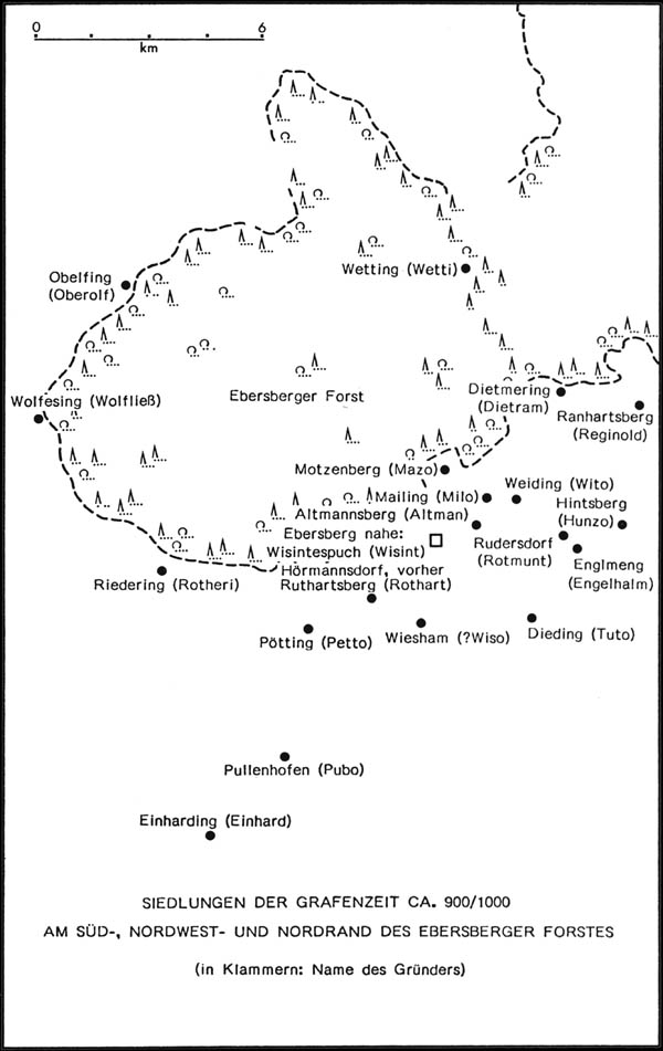 Der Ebersberger Forst und die Rodungssiedlungen aus der Zeit der Grafen von Ebersberg, 10/11 Jahrhundert In Klammern die mutmaßlichen Namen der ersten Ortsherren [aus: Flohrschütz, Der Adel des Ebersberger Raums im Hochmittelalter,48]