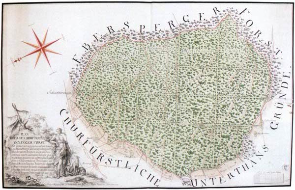 Der Anzinger Forst, der westliche Teil des Ebersberger Forstes, auf einem Plan von 1763, angefertigt vom Ingenieur und Feldmesser Franz Xaver von Pusch [1723-1782], 1763 [Bayerisches Hauptstaatsarchiv Pls5373]